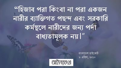 বংলাদেশে স্বতন্ত্রভাবে ধর্ম পালন,চলাফেরা এবং নিজের মতামত প্রকাশের অধিকার সংবিধান দ্বারা সংরক্ষিত। ২০১০ সালের ৮ এপ্রিল, বাংলাদেশ হাই কোর্ট রায় ঘোষণা দেন যে,হিজাব পরা কিংবা না পরা একজন নারীর ব্যাক্তিগত পছন্দ এবং সরকারি কর্মস্থলে নারীদের জন্য পর্দা বাধ্যতামূলক নয়। এই মামলায় সংবিধানের ২৭, ৩১, ৩২ ৩৯ অণুচ্ছেদ লঙ্ঘনের অভিযোগ আদালত আমলে নেন। এ প্রসঙ্গে বিচারক সৈয়দ মাহমুদ হোসেন এবং সৈয়দা আফসার জাহান বলেছেন- “ বাংলাদেশে এমন কোনো প্রচলিত প্রথা নেই যা নারীদের মাথা ঢেকে রাখতে বাধ্য করে।সাম্প্রতিক বছরগুলোতে, নারীদের এই প্রথা মানতে বাধ্য করার চেষ্টা দেখা গেছে, কেবল ব্যক্তিগত পর্যায়েই নয় বরং সরকারি এবং বেসরকারি কর্মস্থলেও।’’বিচারকরা আরও বলেন যে, এই মামলা প্রমাণ করে যে, পাবলিক স্থান, স্কুল, শিক্ষাপ্রতিষ্ঠান এবং অন্যান্য শিক্ষা কার্যক্রমে নারীদের এবং মেয়েদের অধিকার লঙ্ঘিত হচ্ছে।